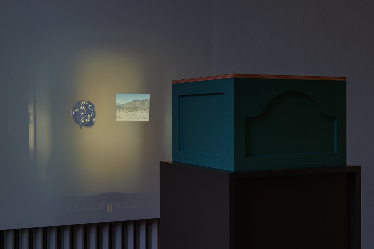 Doris Guo, Alna Senter, 2024, MDF with oak veneer, pine, acrylic paint, wood stain, opaque projector, stainless steel, ceramic