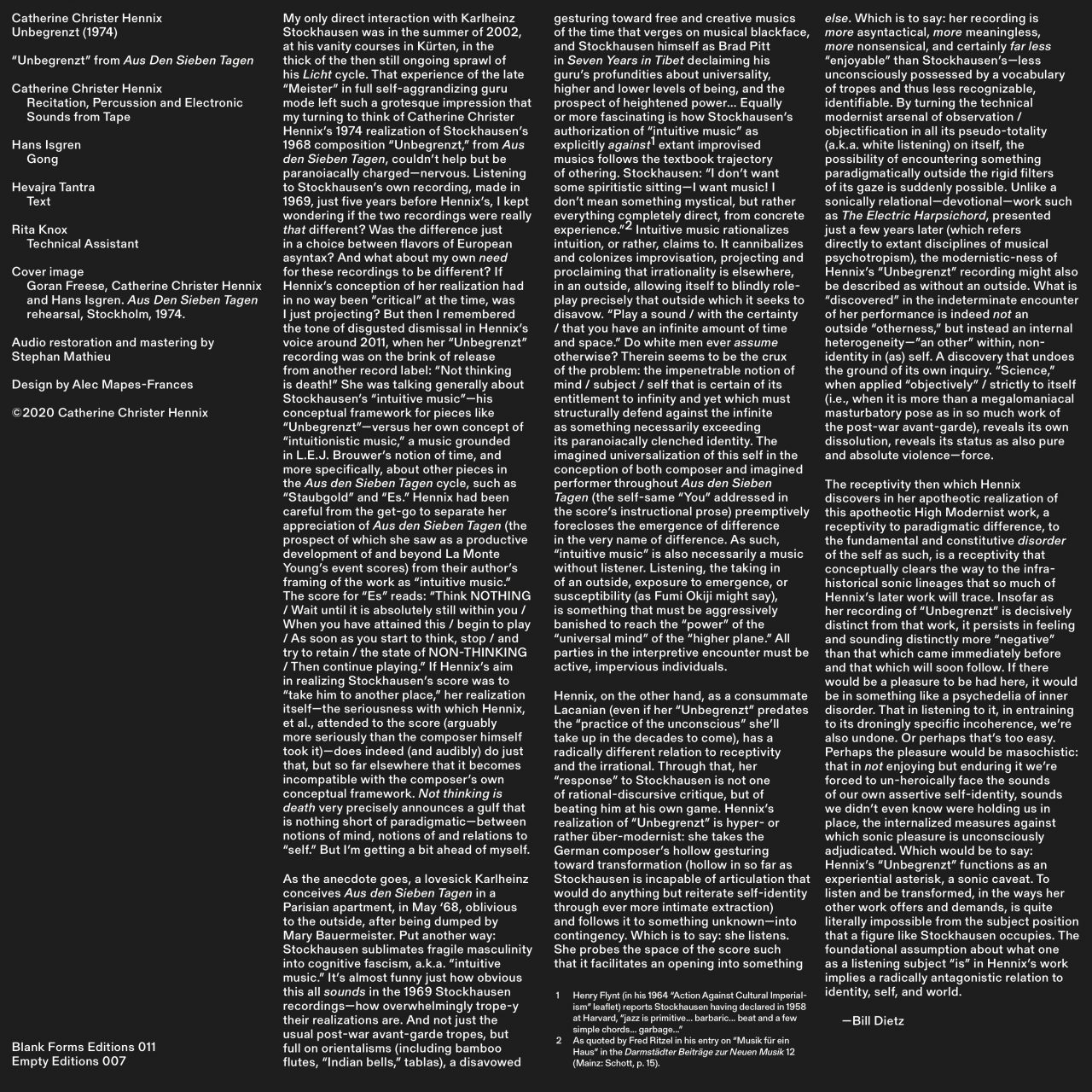 Unbegrenzt is the third in an ongoing series of archival records of the unheard music of Swedish composer Catherine Christer Hennix, co-released by Blank Forms Editions and Empty Editions. It follows Selected Early Keyboard Works and Selections from 100 Models of Hegikan Roku (named the #1 archival release of 2019 by The Wire), in addition to a two-volume collection of Hennix’s writing titled Poësy Matters and Other Matters.