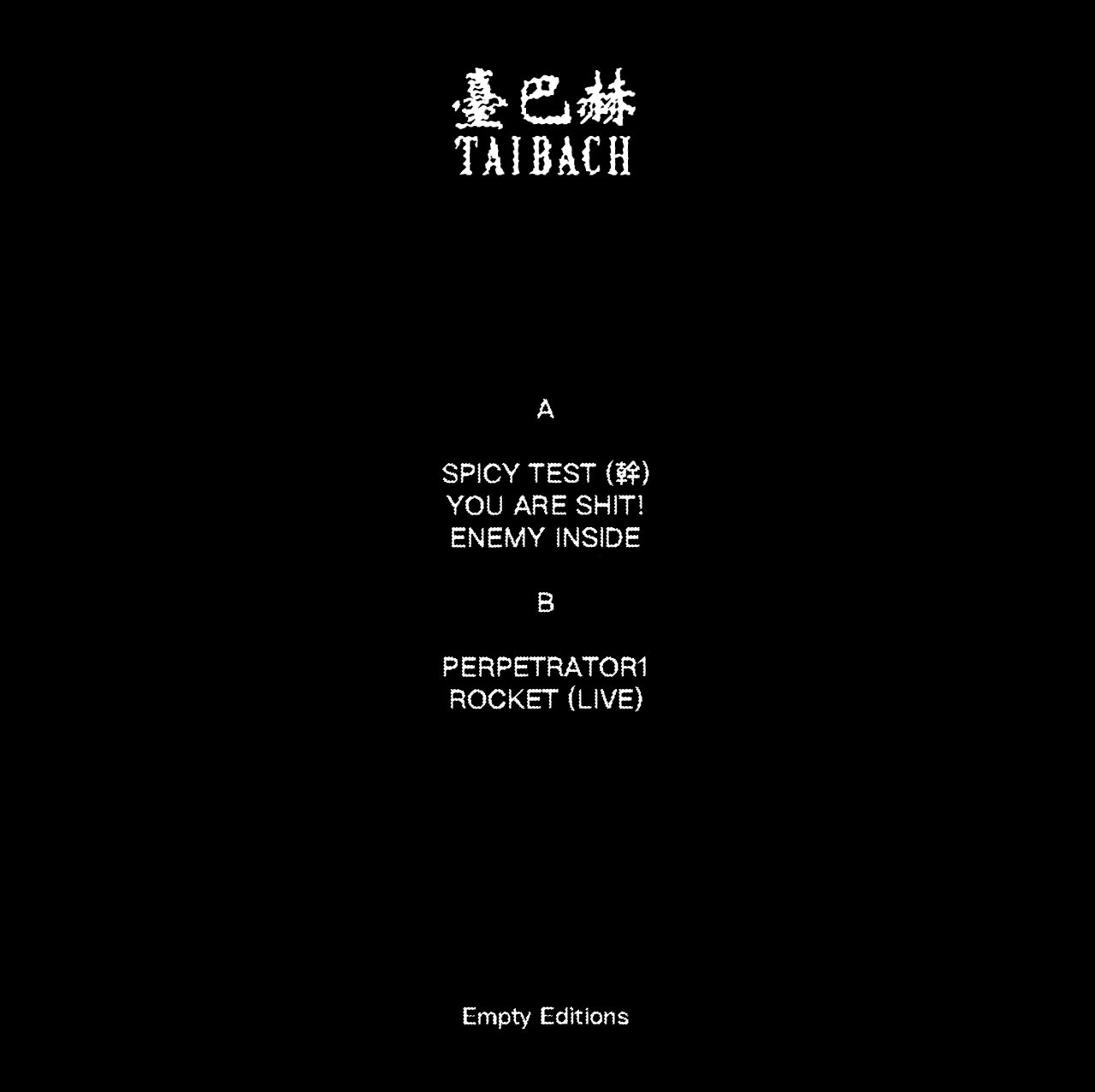 Taibach’s debut LP contains a rawness and intensity that excels in club contexts, spilling over into more varied strands of experimental and underground music. While the music itself is primed for big room sound systems, the omnivorous use of guitar, effects pedals, and sampling techniques alongside stalwart drum programming also allow for more intimate listening—soundtracking both club depravity and solitary walks in equal measure. The kosmische proto-electro bite of Side A opener “Spicy Test” furnishes a terse blueprint for Taibach’s aural vocabulary: skeletal drums brought deliberately into the red provide a burnt, metallic underpinning to the record’s five tracks. Across the LP, rhythm is complemented by asymmetric washes of tape hiss, feedback, and filtered voices which ride alongside the drum patterns. Tracks “You Are Shit!” and “Enemy Inside” carve out wide expanses for filtered chords and sequenced synths to reflect against uncoiling rhythms. Astute listeners will discern a long engagement with UK, European, and US dance music from the 1990s up to the present in their inspired ability to set the drum machine against a distinctly East Asian industrial backdrop—channeling the sound of a dystopic future of armed conflicts and ground invasions where the hastily built edifices of Confucian capitalism resurface as detention centers and fallout shelters. The LP culminates in “Rocket (Live),” an opus of live sound system music that carries with it the hot heat of a subterranean, neon-lit industrial catacomb filled with vampiric club-goers. As guitar noise billows out over a militant rhythm that recalls everything from darkwave to Container (or Alan Vega & Martin Rev’s early Suicide records) the track builds into an assailing polyrhythm that showcases a dancefloor severity at the height of their transportive powers.
