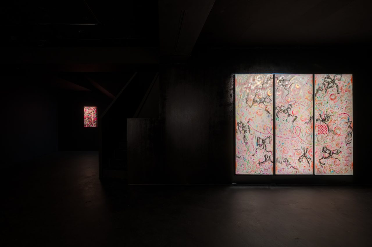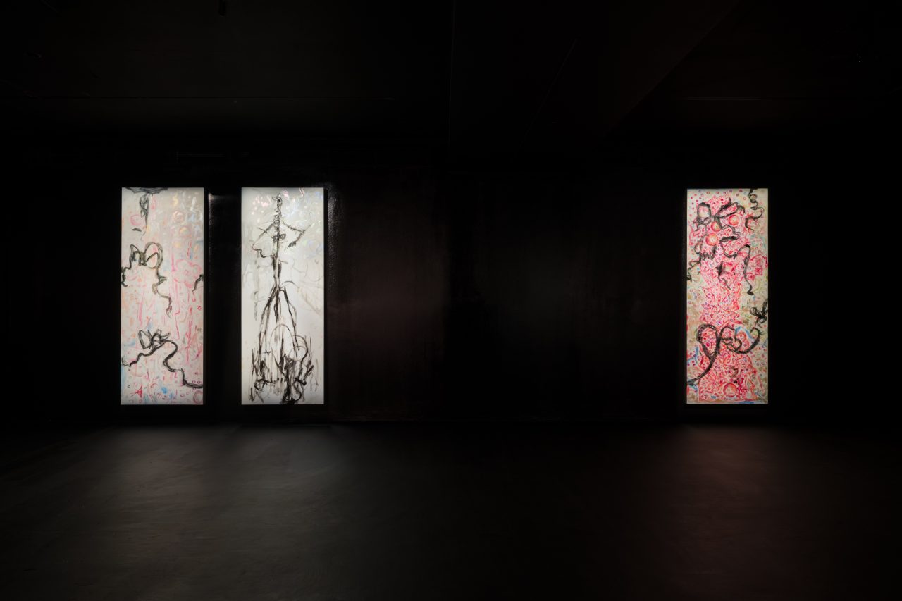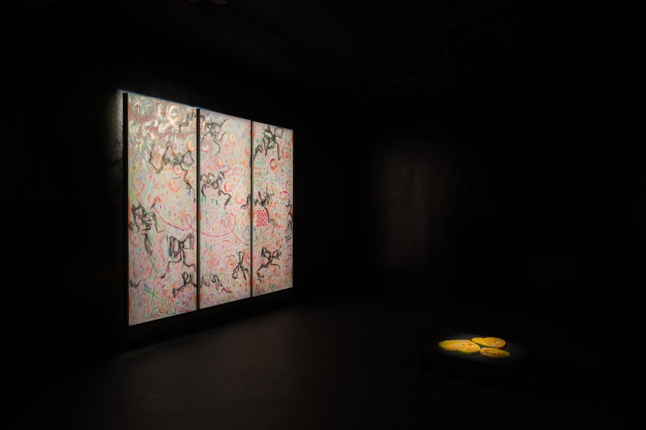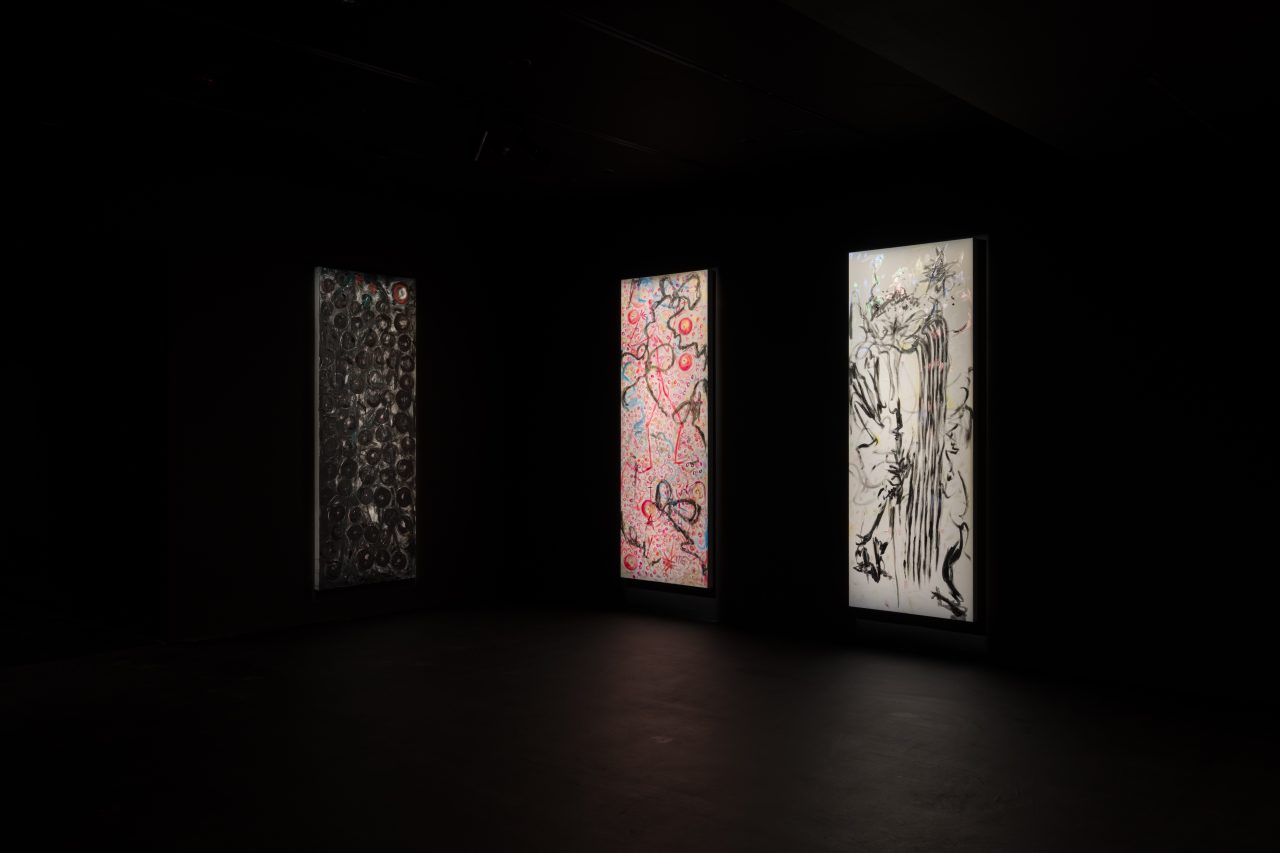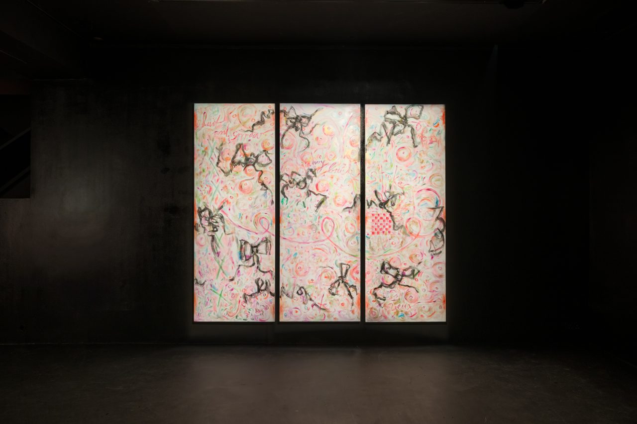 科特爾的繪畫以一種全新的筆觸把彼此縫合於空間裡——動態的、書法般的黑在密集的畫面穿梭流動。科特爾爬行的筆觸漂浮在垂直的畫布之上,彷如題跋或仿製印章,既語義又非語義、具象又抽象。它們展演了書寫與繪畫之間界限的瓦解,呈現為緩緩振盪的反向脈動,在一片活力的斷奏符號背景之上漂浮。變化萬端的黑色線條把我們的注意力導向那些省略和間隙,同時點出並衍生我們各自的表達。這些三聯畫在充滿能量的虛空中向彼此延伸,一如祭壇畫或扇子——它們向外展開,將內在的距離拋進豐饒的黑暗之中。