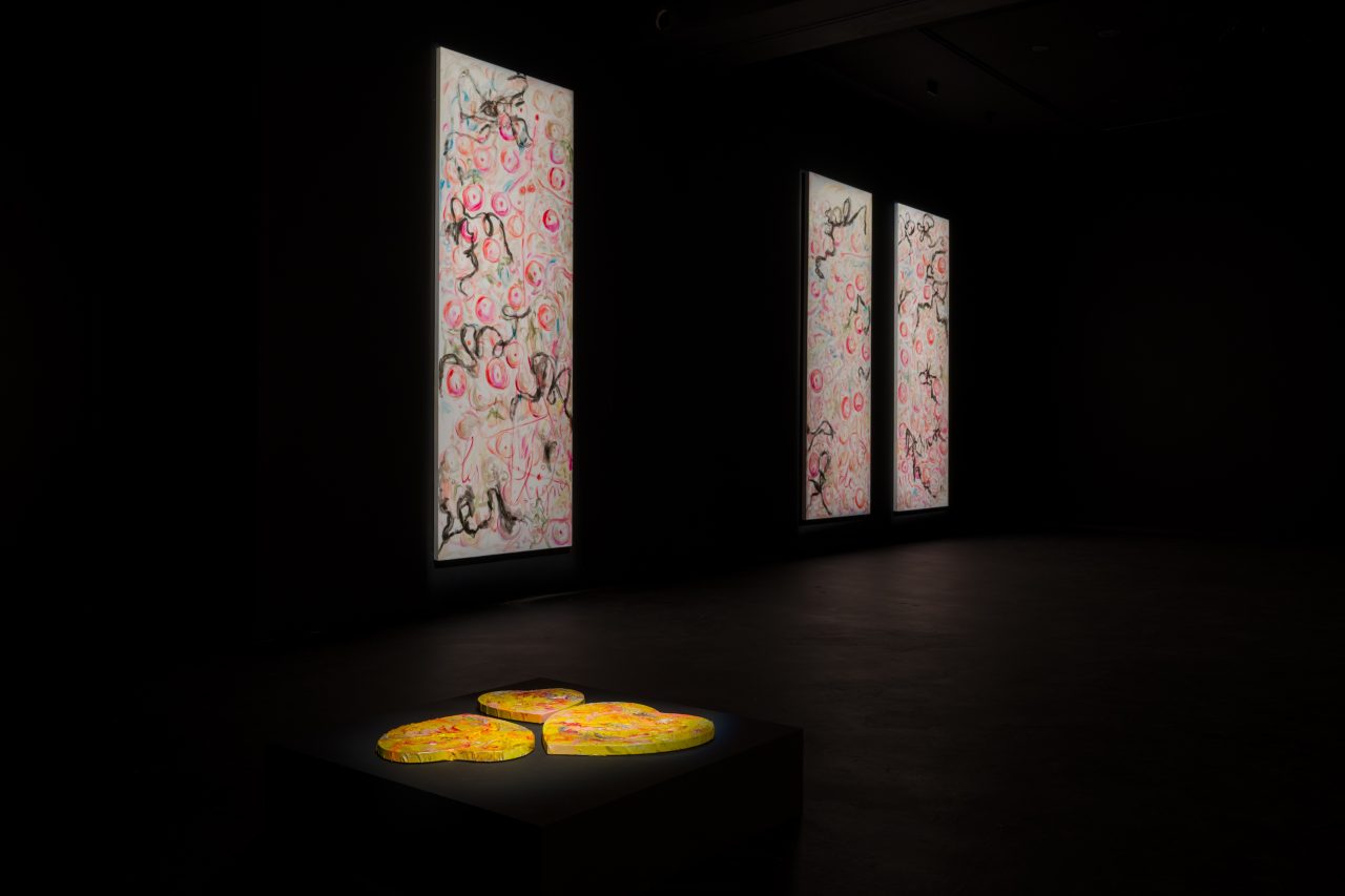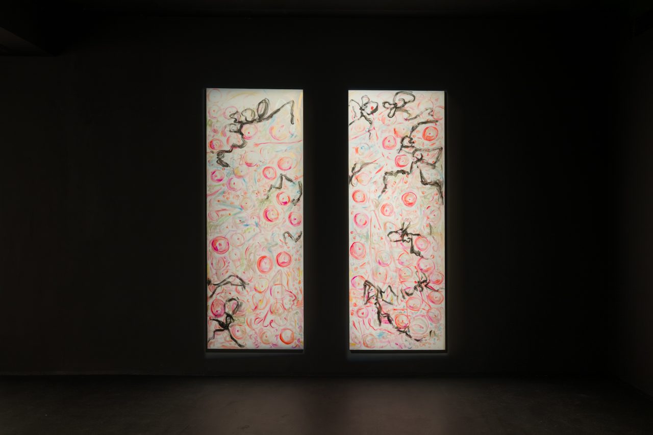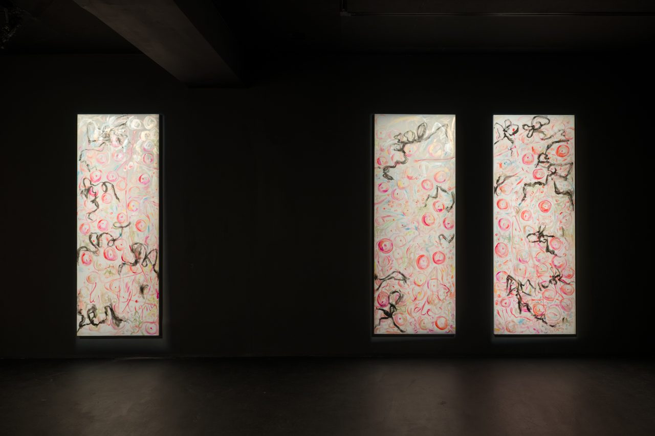 在「近作」中,科特爾創作了一系列相互關聯的繪畫,以回應 Empty Gallery 獨特的空間模型所帶來的挑戰。這些新作主要採用三聯畫的形式,將每一幅狹長的畫板都概念化為一個物理上獨立但主題上相互依存的單子。在這些閃爍的自我指涉領域當中,我們能辨認出一些零星散布的標誌性形態——球體和花環、斜線和絲帶、豐盈的花朵和寶石般的門戶。過去的主題和風格相互碰撞,去舊迎新──科特爾式的胡鬧大合唱。時而厚重時而輕盈,蘊含著對阿爾貝托·賈科梅蒂、艾蜜莉·勃朗特、《芥子園畫傳》等不穩定暗示。
